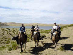 Camel rides in the Mongol Els sand towards to Sangiyn Dalai, which is the one of the largest salt lakes in the region. Bivouac near the sacred mountain of Durvuljin Khairkhan.