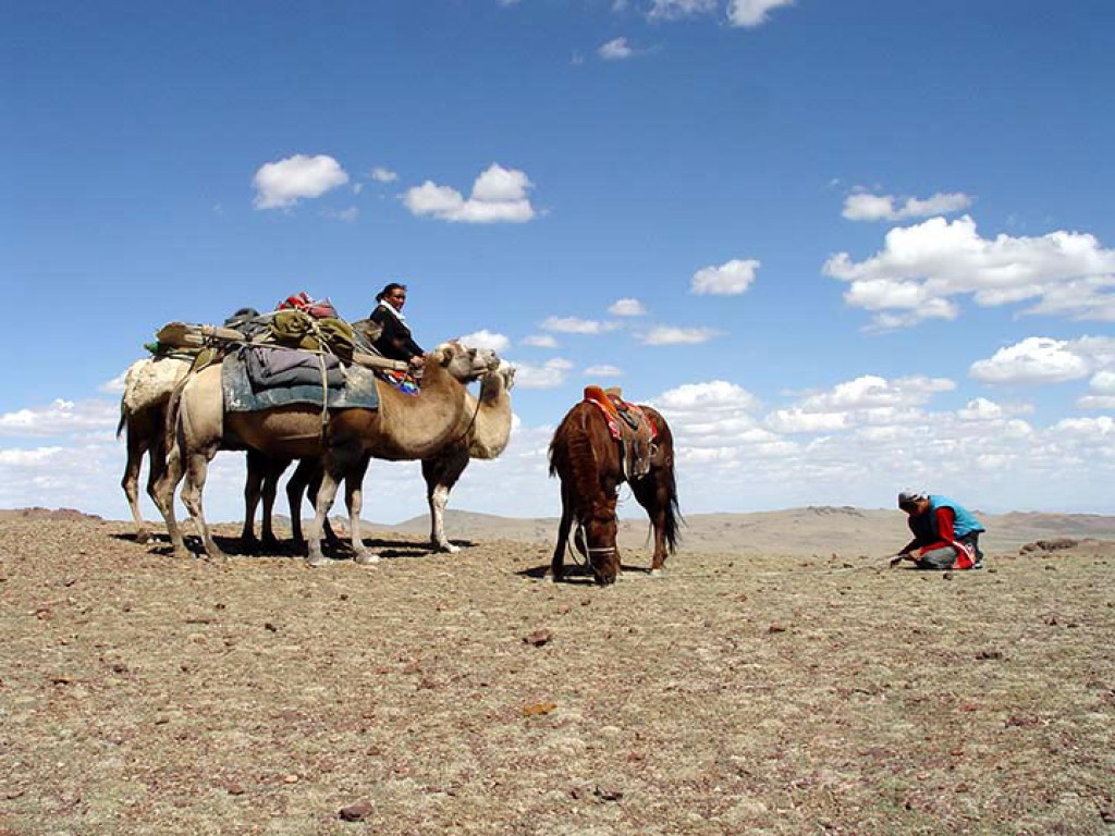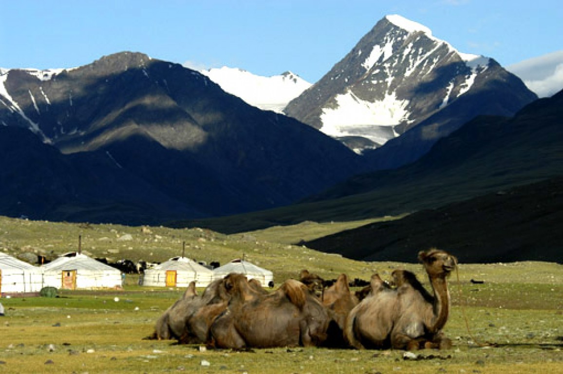 Departure with 4x4 towards the lake of Ajig where lies the camel guide from Altai after flight. Discovery of this region, there is rare animals as mountain sheep, wild goat, snow leopard, and among the birds, the bearded vulture and pheasant in Altai and Khasagt Khairkhan mountains, which is 3578 m high. The Khassagt Khairkhan located in the west and southwest of the Gobis of Khuis and Sharga and northeast of the Zavkhan River basin. This will be part of your camel riding area. Arriving late in the day where we meet with the camel driver, his family and the camel team. Night in yurt